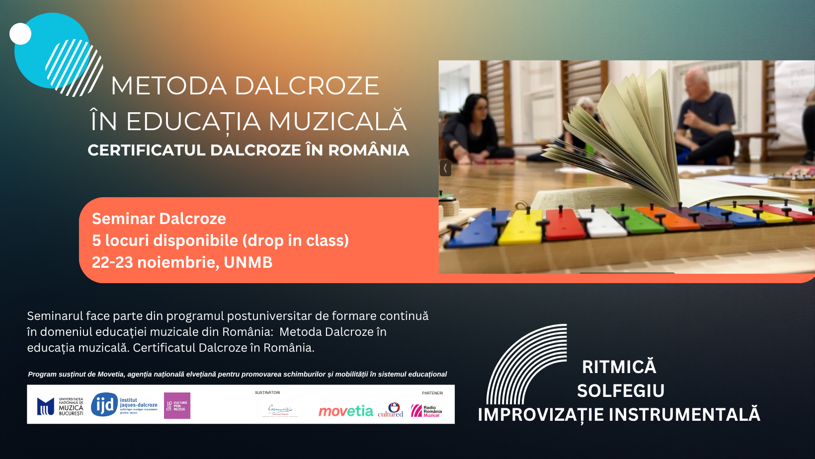 Primul Seminar Dalcroze se va desfășura în weekendul 22–23 noiembrie 2025, la Universitatea Națională de Muzică din București, marcând debutul programului postuniversitar.